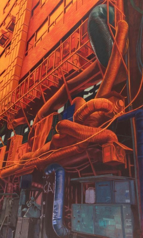 전상원 작가의 작업은 도시를 단순한 배경이 아닌 살아 있는 정서의 장으로 해석하는 데 특징이 있다. 복잡하게 얽힌 배관과 외벽, 빛과 그림자, 건물의 표면과 흔적들은 그의 화면 안에서 하나의 심리적 풍경으로 재구성된다. 이는 빠르게 변화하는 도시 문명 속에서 인간이 경험하는 감정의 파편들을 시각 언어로 풀어낸 결과물이라 할 수 있다.