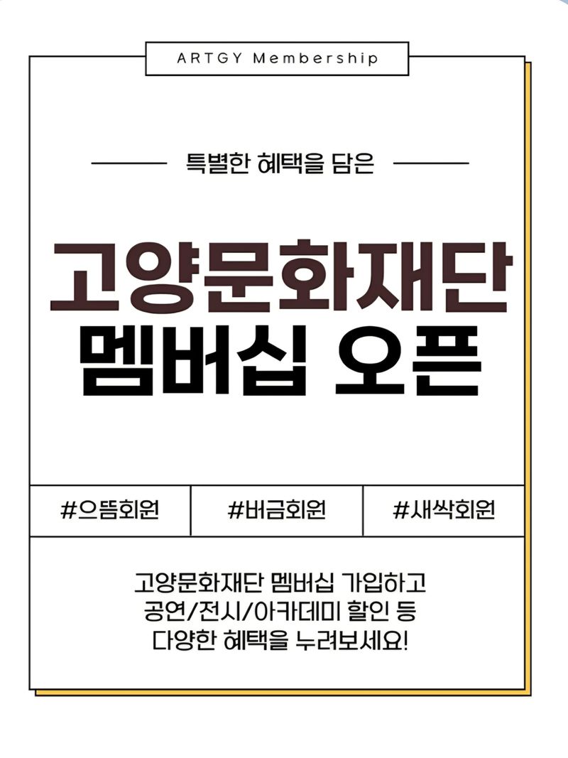 [문화=코리아아트뉴스 이청강 기자] (재)고양문화재단(이사장 이동환, 대표이사 남현)이 기존의 일반 회원제도와 별도로 유료 회원제인 <고양문화재단 멤버십>을 신설 도입한다고 밝혔다.