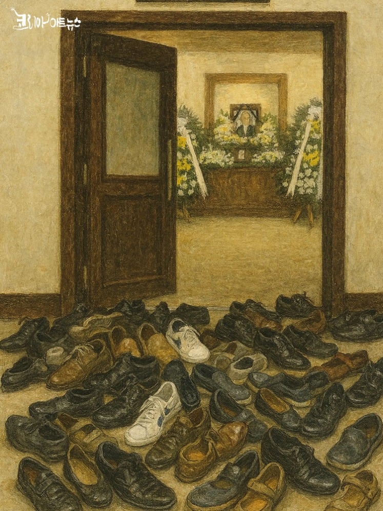 우리 사후에도 누군가는 형식적인 인사를 나누고, 형식적인 화환을 보내고, 형식적인 꽃과 향과 소주와 과일과 촛불과 돈봉투가……. 내가 죽을 때는 편안히 갈까, 고통을 오래 겪다 갈까 스스로도 관심사다. 이 시에서 신발은 아주 중요한 사물이다. 초빙교수로 중대 문창과에서 20년 동안 재직하다 돌아가신 구상 교수님의 장례식장이 바로 그랬었다. 신발이 뒤엉켜 자기 것 찾는 것에 시간이 걸렸었다. 어떻게 죽느냐는 어떻게 사느냐와 동전의 앞, 뒷면 꼴이다. 눈앞에 닥치지 않은 죽음을 생각하는 것보다는 오늘 하루를 어떻게 살 것인가를 생각해야 할 것이다. 승한 스님은 바로 그것을 이 시로 설법하고 있다.