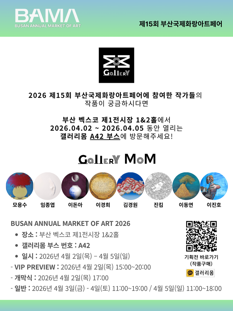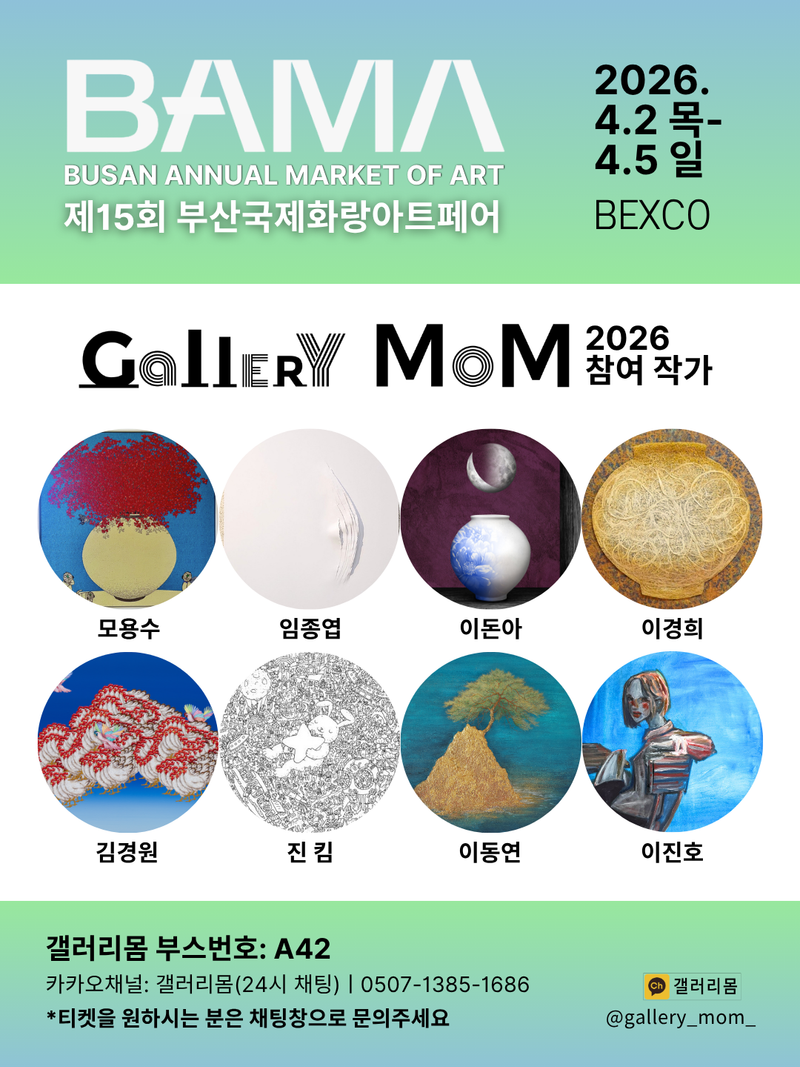 오는 4월 부산에서 열리는 국내 대표 아트페어 ‘제15회 부산국제화랑아트페어(BAMA 2026)’에 갤러리몸(Gallery MoM)이 참여해 8인 작가의 작품세계를 선보인다. 전시는 2026년 4월 2일부터 5일까지 부산 벡스코(BEXCO) 제1전시장 1·2홀에서 열리며, 갤러리몸은 A42 부스에서 관람객을 맞는다.
