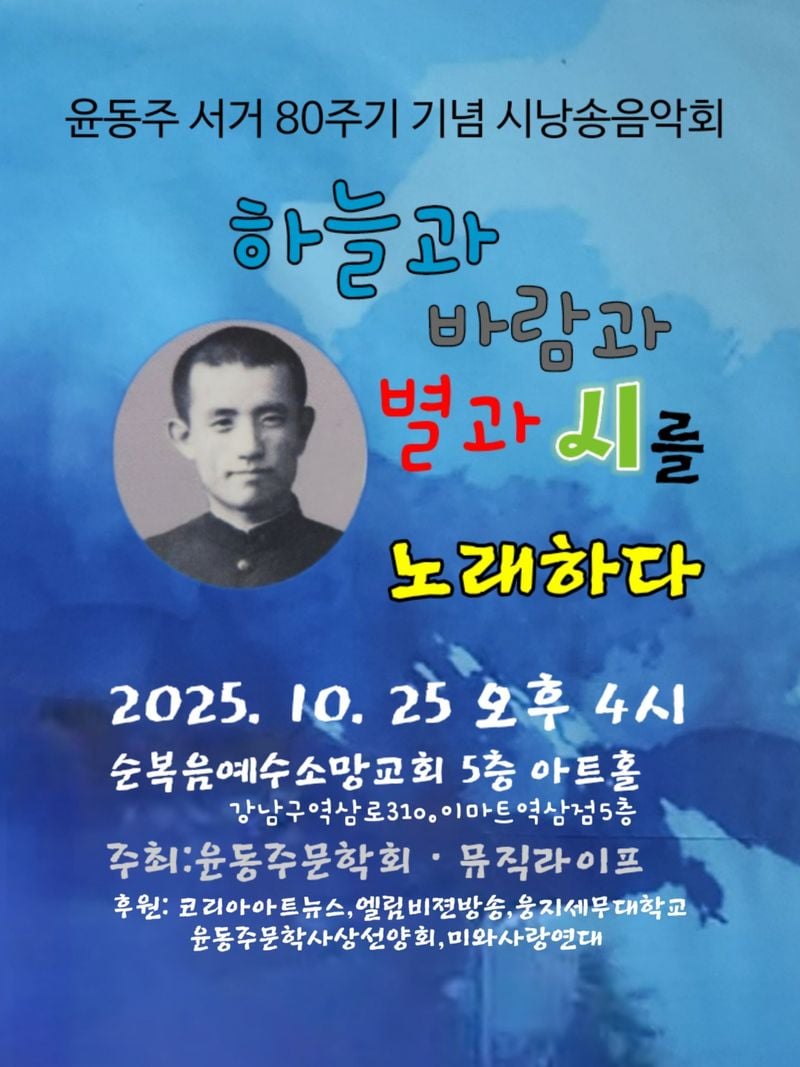 윤동주 시인의 서거 80주기를 기리는 시낭송 음악회가 오는 10월 25일(토) 오후 4시, 서울 순복음예수소망교회 5층 아트홀에서 열린다. ‘하늘과 바람과 별과 시를 노래하다’라는 주제로 열리는 이번 행사는 윤동주문학회( 회장 박호용) 와 뮤직라이프(대표 지영순)가 공동 주최하고, 코리아아트뉴스, 엘림비젼방송, 웅지세무대학교, JWM선교법인, 미와사랑연대, 윤동주문학사상선양회가 후원한다.