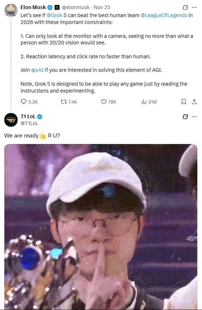 [KAN] 일론 머스크, 세계 최강 게임 챔피언 도전한다 - ‘그록5’로 T1에 도전… “우린 준비됐다”