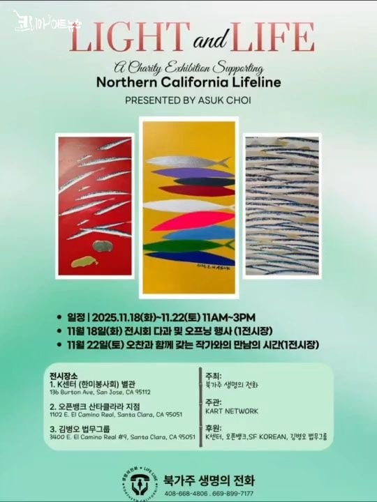 [미국 캘리포니아 = 코리아아트뉴스] 추수감사절을 앞둔 미국 북가주 한인사회에 따뜻한 예술 나눔의 장이 열렸다. 북가주 생명의 전화(원장 황종연)가 주최하고, ‘꽁치화가’로 알려진 중견 작가 최아숙 화가의 작품 기증과 후원으로 마련된 《빛과 생명》 작품 나눔 전시회가 11월 18일(화) 산호세와 산타클라라에서 동시에 개막했다.
