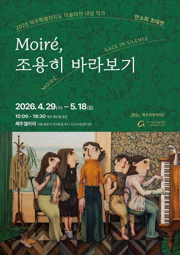 2025년 제주특별자치도 미술대전에서 대상 수상작 《우리를 위한 연주》를 선보이며 주목받은 작가 안소희가 오는 4월 29일부터 5월 18일까지 서울 종로구 인사동 제주갤러리에서 초대전 《Moiré, 조용히 바라보기》를 연다. 이번 전시는 제주에서의 작업을 서울로 확장해 보여주는 자리로, 개인의 내밀한 시선에서 출발한 이야기가 동시대의 감각과 어떻게 맞닿는지를 탐구한다.