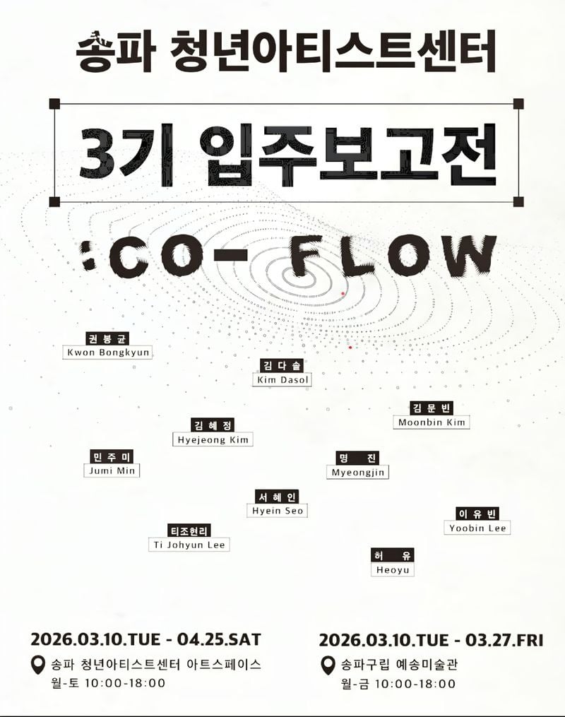 [송파=코리아아트뉴스 이청강 기자] 서울 송파구(구청장 서강석)는 송파청년아티스트센터 제3기 입주작가 10인의 첫 전시 ‘Co-Flow’를 3월 10일 개최했다고 밝혔다.