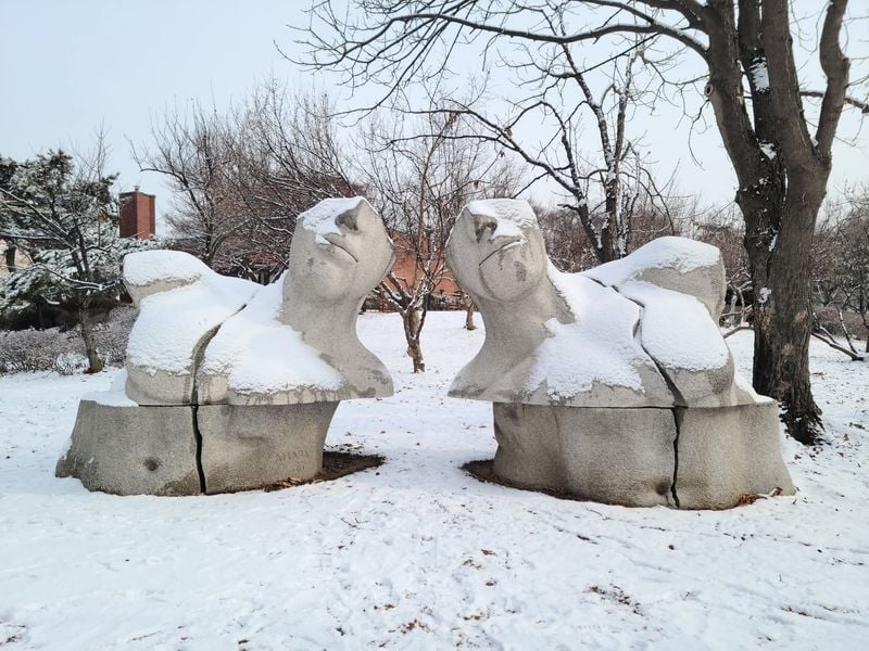 서울올림픽공원 숲길을 걷다 보면 두 사람이 서로를 향해 기울어진 거대한 화강암 조각을 만난다. 알제리 출신 조각가 아마라 모한(Amara Mohan)이 1987년 제작한 작품 ‘대화’다. 이 작품은 1988 서울올림픽을 기념해 조성된 국제조각공원에 설치된 작품으로, 높이 약 3.3m, 길이 약 6m에 이르는 대형 화강암 조각이다. 서로 마주보며 몸을 기울인 두 인물 형상이 특징적이며, 올림픽공원을 대표하는 상징적 조형물로 자리 잡고 있다.