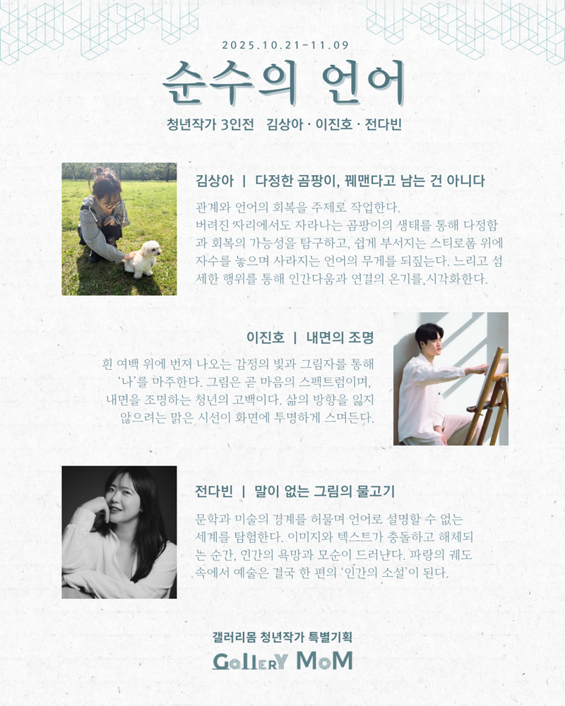 서울 마포구 서교동 메세나폴리스몰에 위치한 복합문화공간 갤러리몸(Gallery MoM, 김손비야 대표)은 오는 2025년 10월 21일(화)부터 11월 9일(일)까지, 청년작가 특별기획전 《순수의 언어》를 개최한다. 10월 22일(수) 오후 6시 30분 개최되는 오프닝에서는 작가 3인과의 아티스트 토크를 포함한 다양한 행사가 열린다.