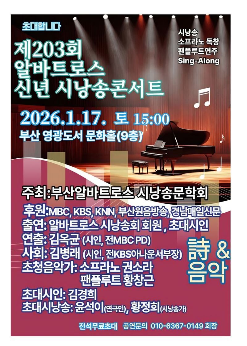 [문학=코리아아트뉴스 이청강 기자] 오는 1월 17일 오후 3시, 부산 영광도서 문화홀 9층에서 제203회 알바트로스 신년 시낭송콘서트가 개최된다.