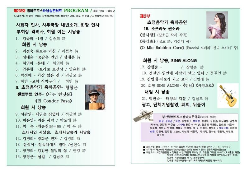 연출을 맡은 알바트로스시낭송회 회장 김옥균은 "병오년 2026년 1월 17일 오후 3시에 제203회 알바트로스 신년 시낭송콘서트를 개최합니다." 며, 많은 관심과 참여를 당부했다.