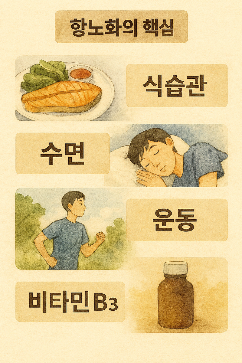 비타민 B3는 NAD의 재료이고 NAD는 미토콘드리아·DNA 복구·염증 조절의 핵심이며