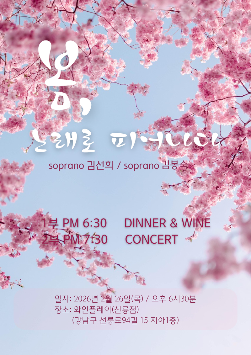 [음악=코리아아트뉴스 이청강 기자] 오는 2월 26일 목요일 오후 6시 30분, 서울 강남 선릉역에 위치한 와인플레이 선릉점에서 특별한 봄맞이 음악회가 개최된다.