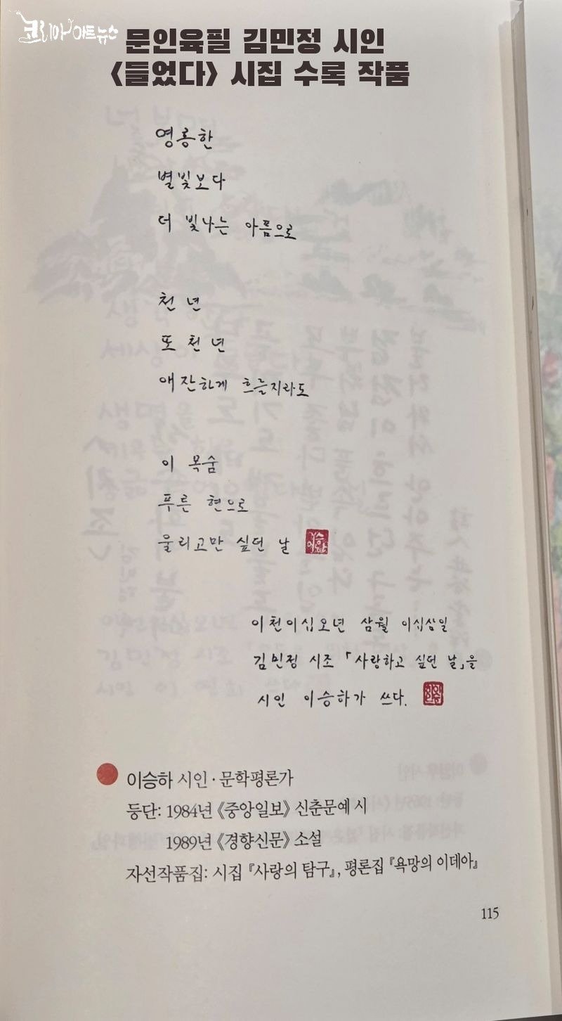 문인육필 150여 점 작품 수록...본보 KAN 이승하 시인, 문인육필 작품 참여