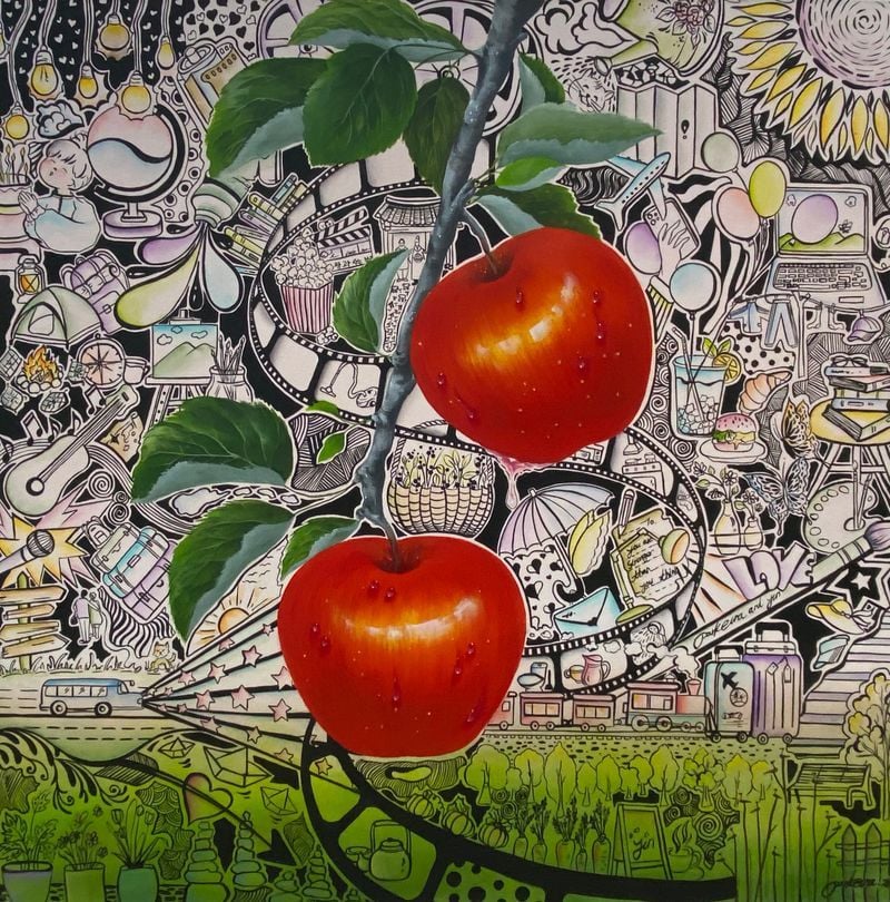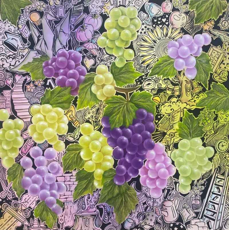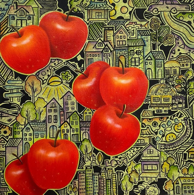박은아 작가의 작품은 전통적인 정물화의 틀을 과감히 확장한다. 과일, 꽃, 케이크와 같은 익숙한 소재 위에 한국적 일상의 기호들이 겹겹이 얹히며, 하나의 ‘이야기 장면’으로 재구성된다.