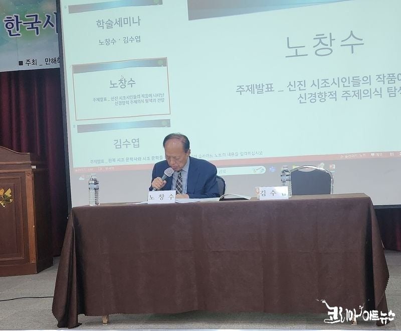 첫 발표에 나선 노창수 시인(한국문인협회 부이사장)은 《신진 시조시인들의 작품에 나타난 신경향적 주제 의식 탐색과 전망》이라는 주제로, 젊은 시조 시인들의 작품 속에 나타나는 새로운 흐름을 분석했다. 노창수 시인은 '시조의 위력은 가멸차다' 고 강조하며 월터 페이터(Pater,Walter,1839~1894)의 말을 인용하여 '모든 예술은 리듬과 재결합되어야 한다' 고 강조했다. 율격과 리듬을 중시하는 시조가 모든 예술의 핵심이 될 수 있다고 강조한 것이다.