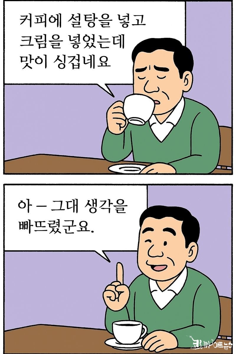 옴니버스Art/TV-KANTV_KAN[KAN 만화] 커피 _ 윤보영작가 이청강입력북마크공유가글자크기프린트댓글[시와 만화] 커피에 설탕을 넣고 크림을 넣었는데 맛이 싱겁네요... 아 ― 그대 생각을 빠뜨렸군요.[만화 : 이청강 기자]커피 윤보영 커피에설탕을 넣고크림을 넣었는데맛이 싱겁네요아 ―그대 생각을 빠뜨렸군요.작가 이청강카카오톡페이스북트위터밴드URL복사
