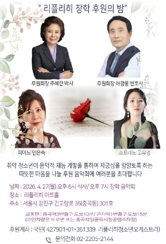 이번 후원음악회는 장애 청소년, 음악 전문가, 그리고 음악을 사랑하는 시민들이 함께하는 무대로 꾸며진다. 사회자는 직접 공연에도 참여해 관객과의 교감을 나누며, 참석자들은 간단한 식사와 함께 따뜻한 선율을 즐길 수 있다. 리플리히는 장애 청소년들에게 악기 연주를 가르치고, 롯데콘서트홀 등에서 그들이 중심이 된 오케스트라 공연을 개최해왔다. 이를 통해 취약 청소년들의 자긍심과 사회적응 능력을 높이는 데 기여하고 있다.