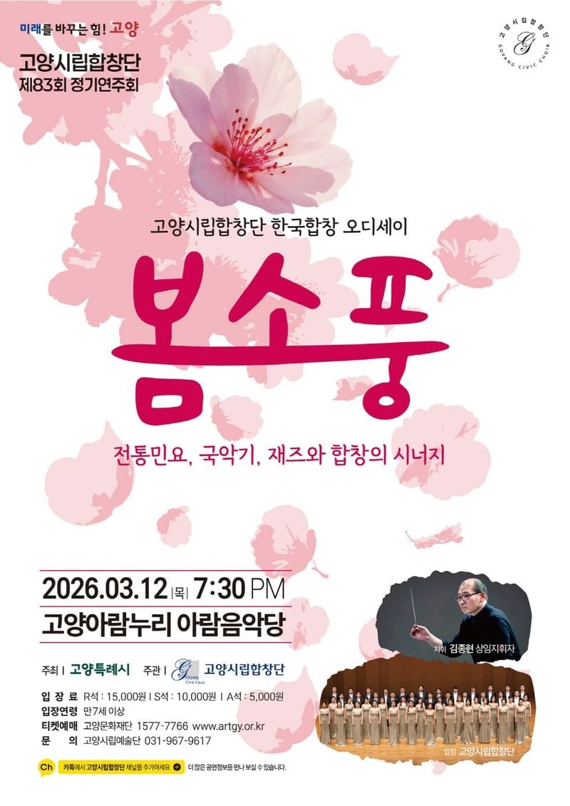 [고양=코리아아트뉴스 이청강 기자] 고양특례시(시장 이동환)를 대표하는 문화사절단인 고양시립합창단(지휘 김종현)이 오는 3월 12일(목) 저녁 7시 30분, 고양아람누리 아람음악당에서 제83회 정기연주회 ‘한국합창 오디세이: 봄소풍’을 개최한다.