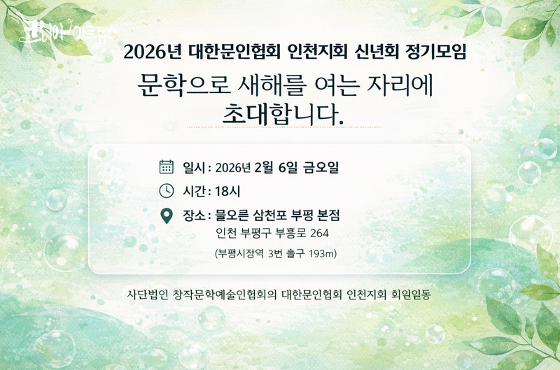 [문학=코리아아트뉴스 이청강 기자] 대한문인협회 인천지회(지회장 주야옥)는 지난 2월 6일 금요일, 인천 부평구 물오른 삼천포 부평 본점에서 "2026년 대한문인협회 인천지회 신년회" 가 성황리에 마쳤다.
