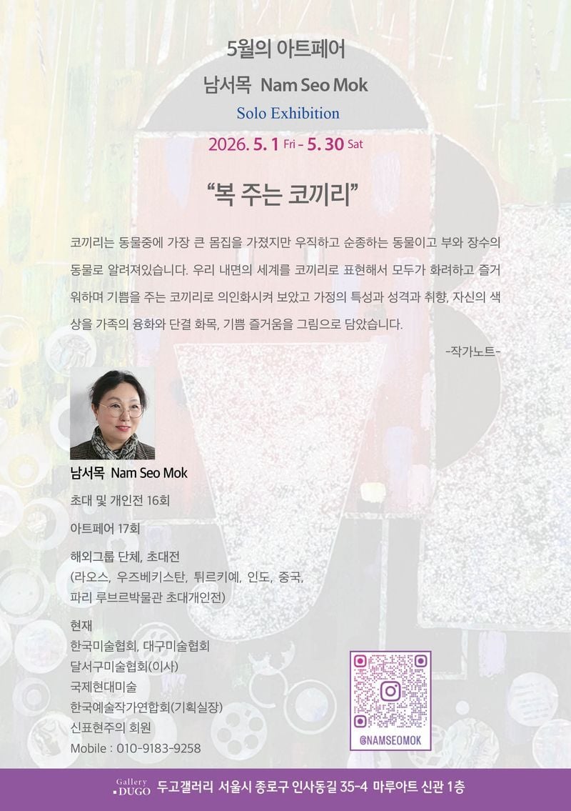 봄의 향기가 거리를 물들이는 5월, 서울 인사동 두고갤러리에 형형색색의 코끼리들이 찾아온다. 두고갤러리(서울시 종로구 인사동길 35-4 마루아트 신관 1층)는 오는 5월 1일(금)부터 30일(토)까지 남서목(Nam Seo Mok) 작가의 개인전 “복 주는 코끼리”를 개최한다. '5월의 아트페어' 기획 시리즈의 일환으로 마련된 이번 전시는 작가의 16번째 초대·개인전이자 17번째 아트페어 참가작으로 구성된다.