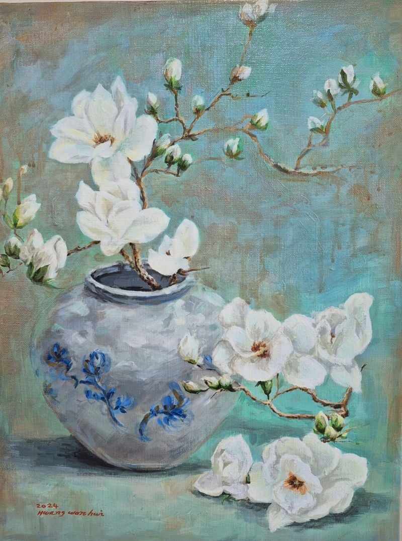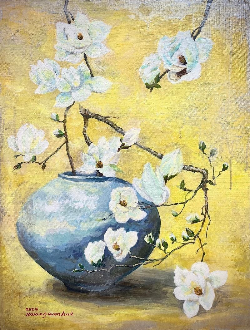 황원휘 작가는 이번 아트페어에서 〈달항아리와 목련〉(2024) 작품을 중심으로 한국 전통의 상징인 달항아리와 봄을 알리는 목련을 병치한 작품을 선보였다. 작품은 달항아리의 고요한 존재감과 목련의 생명력을 대비시키며 ‘비움과 생성’이라는 철학적 메시지를 전달한다.