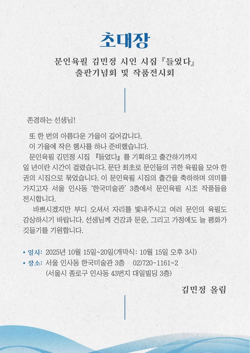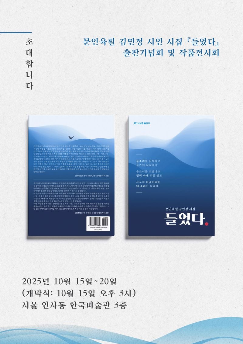 [문학=코리아아트뉴스 이청강 기자] 문학과 예술이 어우러지는 가을, 김민정 시인의 시집 『들었다』 출판기념회 및 문인육필 작품전시회가 오는 10월 15일부터 20일까지 서울 인사동 한국미술관 3층에서 열린다.