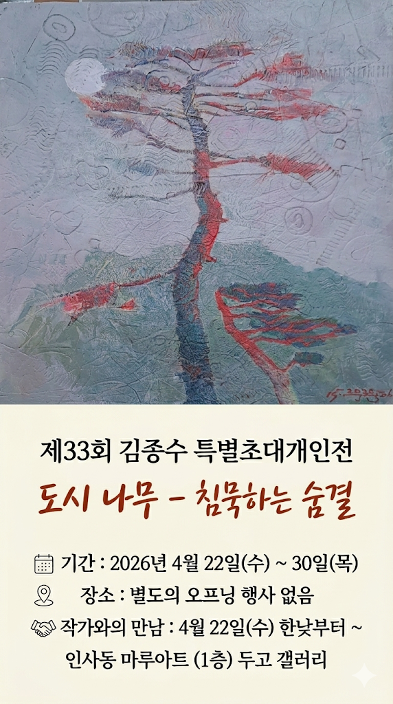 서양화가 김종수(대한민국 회화제 상임고문)가 오는 4월 22일부터 30일까지 서울 인사동 마루아트센터 신관 1층 두고갤러리에서 제33회 특별 초대 개인전 <도시나무 – 침묵하는 숨결>을 연다.