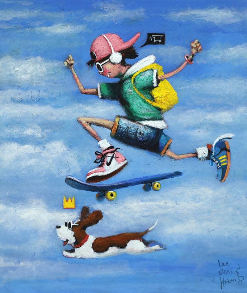 푸른 하늘을 배경으로 스케이트보드를 타는 인물과 반려견이 함께 공중을 질주하는 장면은 자유와 해방감을 상징한다. √ 기호와 웃는 얼굴이 결합된 말풍선은 유희적 감정과 지적 상징을 동시에 담아내며, 반려견 머리 위의 왕관은 동행의 존엄성을 드러낸다. 작가의 어린 시절 반려견과의 기억을 모티브로 한 이 작품은 개인적 경험을 보편적 정서로 확장하며, 관람자에게 긍정적 에너지를 전달한다.