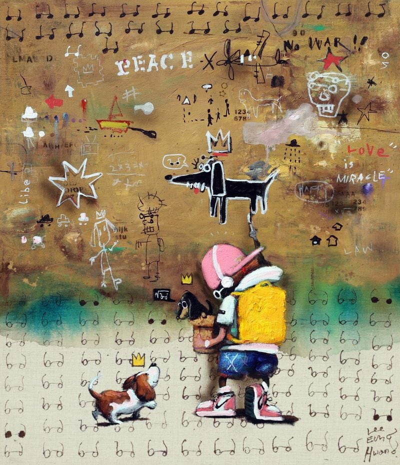 낙서와 그래피티, 문자와 기호가 혼재된 화면은 혼란스러우면서도 질서 있는 시각적 리듬을 형성한다. “PEACE”, “NO WAR!!”, “LOVE is MIRACLE” 등의 문구는 작품의 사회적 메시지를 명확히 드러내며, 왕관을 쓴 개와 음악 기호, 수학식 등은 현실과 초현실을 넘나드는 상징적 장치로 작용한다. 어린아이와 반려견의 등장은 순수함과 동행의 가치를 강조하며, 전쟁 반대와 평화, 사랑이라는 보편적 가치가 개인적 기억과 결합되어 표현된다.