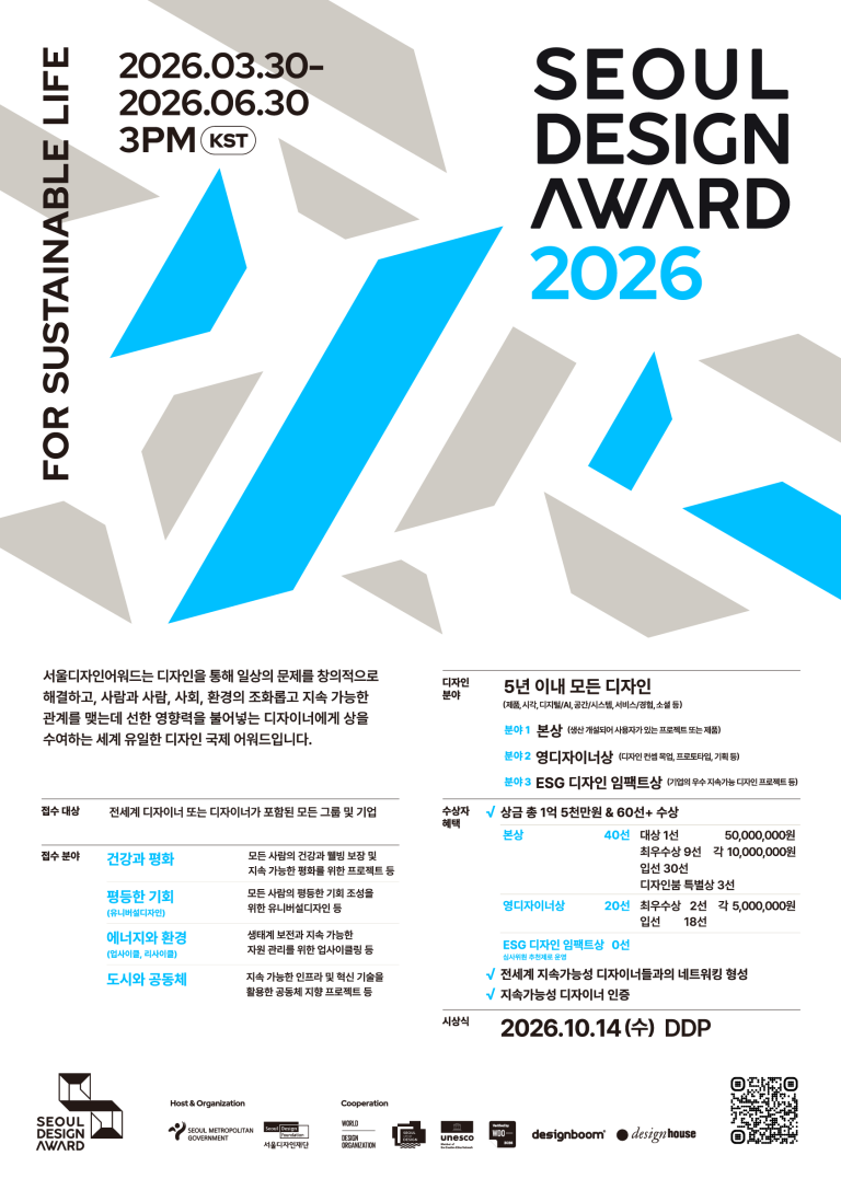 서울디자인어워드 2026이 3월 30일부터 6월 30일까지 접수를 진행한다. 이번 어워드는 전 세계 디자이너 및 그룹·기업을 대상으로 하며, 최근 5년 이내의 모든 디자인 분야(제품, 시각, 디지털/AI, 공간/시스템, 서비스/경험, 소셜 등)를 아우른다. 참가비는 무료다.