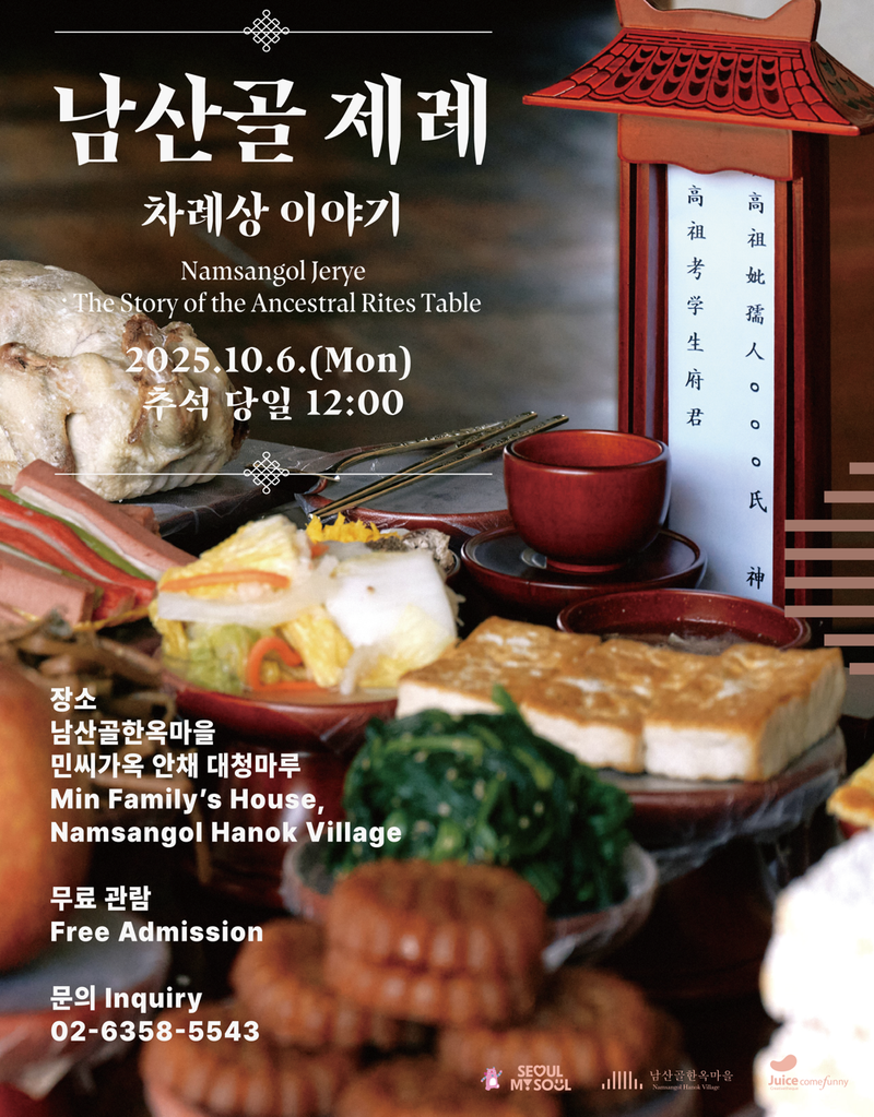 추석 당일인 10월 6일에는 관훈동 민씨가옥 안채에서 ‘남산골 제례, 차례상 이야기’가 진행된다. 이 프로그램은 남산골한옥마을의 관혼상제 사업의 일환으로, 차례상 음식과 절차를 소개하고 직접 절하기, 술따르기 등 제례 의식을 체험할 수 있는 기회를 제공한다. 현장에서는 차례상 퀴즈 이벤트도 마련되어, 정답자에게는 미니 한과 세트와 막걸리가 증정된다.