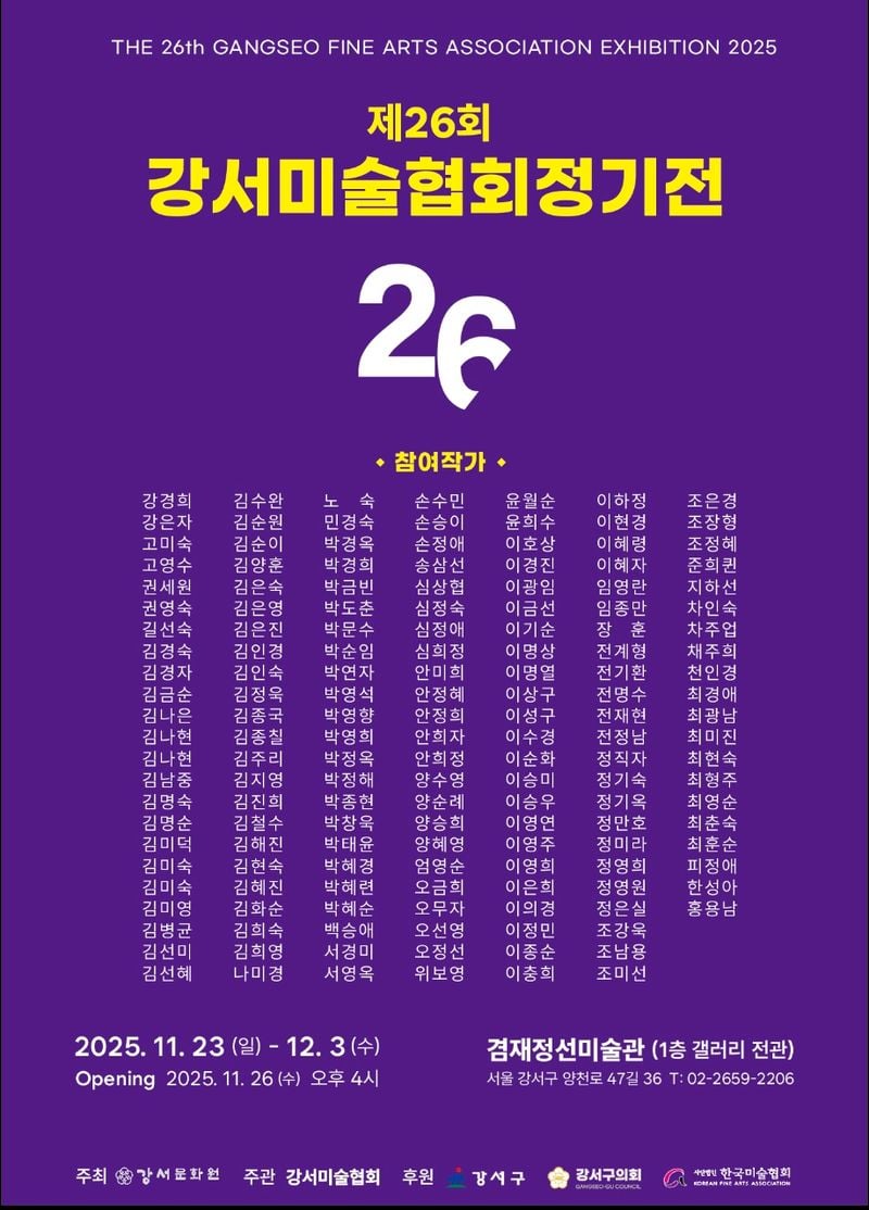 강서미술협회(채주희 회장) 정기전이 겸재정선 미술관에서 11월 23일부터 12월 3일까지 개최된다.
