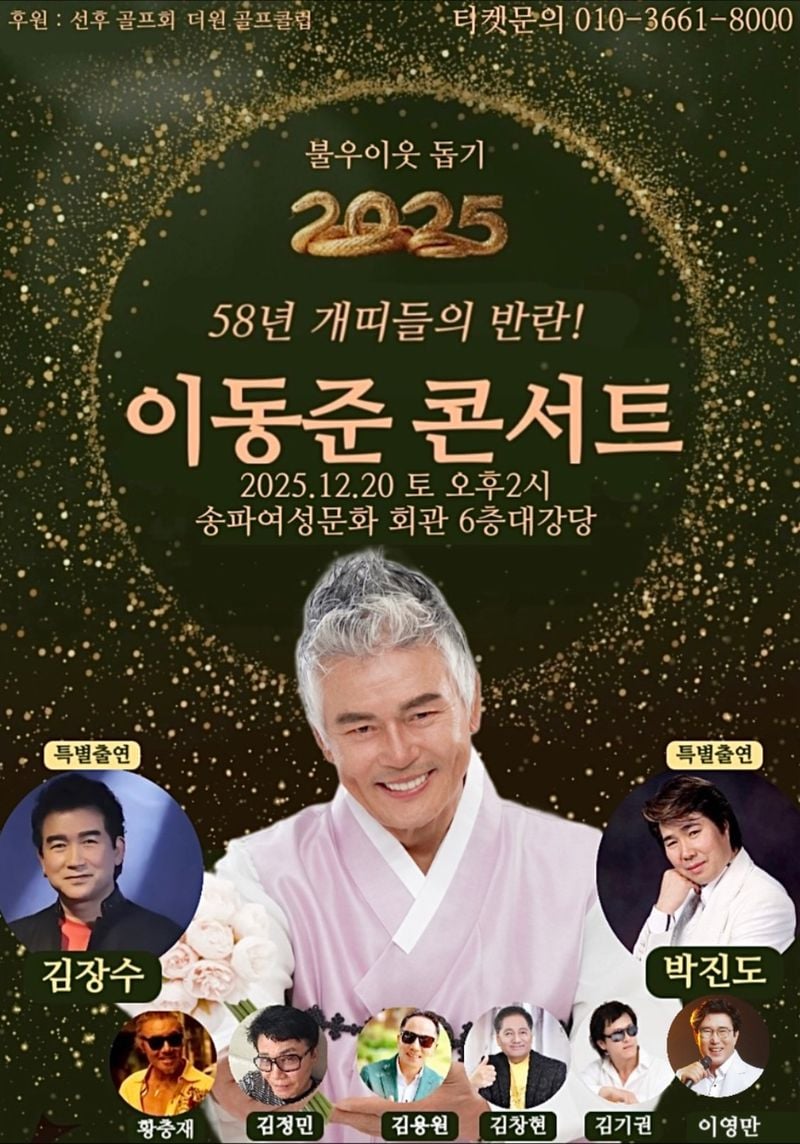 [음악=코리아아트뉴스 이청강 기자] 서울 송파여성문화회관 대강당에서 지난 12월 20일(토) 오후 2시, 가수 이동준의 콘서트 ‘58년 개띠들의 반란!’이 관객들의 뜨거운 성원 속에 성공적으로 개최됐다.