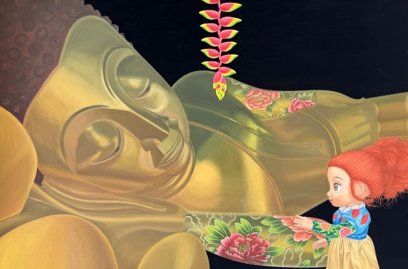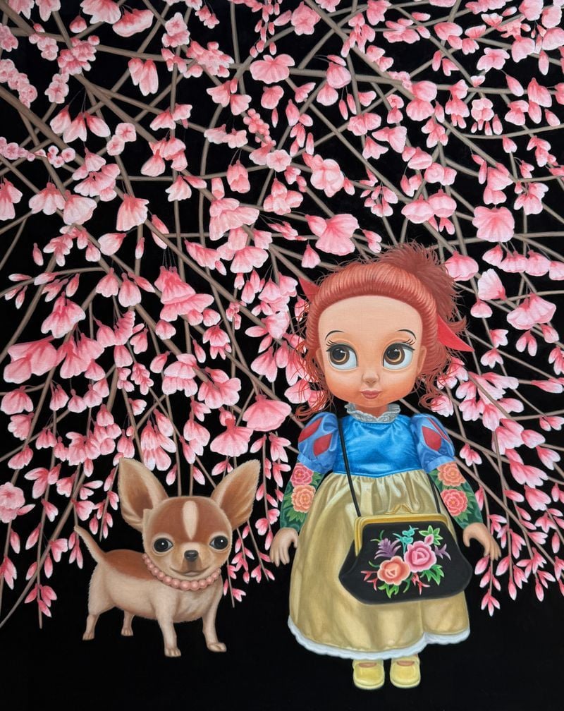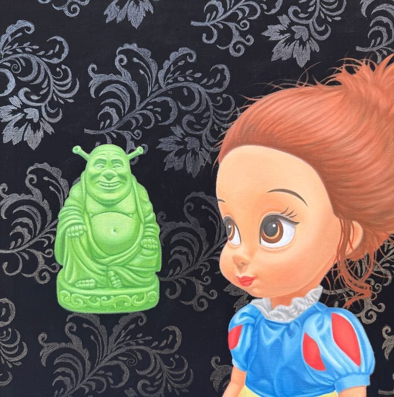 작품 속 백설공주는 더 이상 순결한 동화 속 주인공이 아니다. 핑크빛 머리, 커다란 눈, 현대적 소품과 대중문화의 상징을 지닌 인물로 다시 태어나, 불상과 대면하고, 벚꽃 아래 দাঁ서고, 기묘한 신상(神像)과 마주한다. 검은 배경 위에 부유하는 인물과 상징들은 꿈과 현실, 신화와 소비문화, 숭고와 키치의 경계를 교란한다. 이 조합은 단순한 패러디가 아니라, 오늘의 시선이 어떻게 신성을 만들고 소비하며 오해하는지를 보여주는 회화적 장치다. 포스터와 작품 이미지에서 드러나는 강렬한 대비와 서사적 구도는 전시의 문제의식을 시각적으로 선명하게 부각한다.
