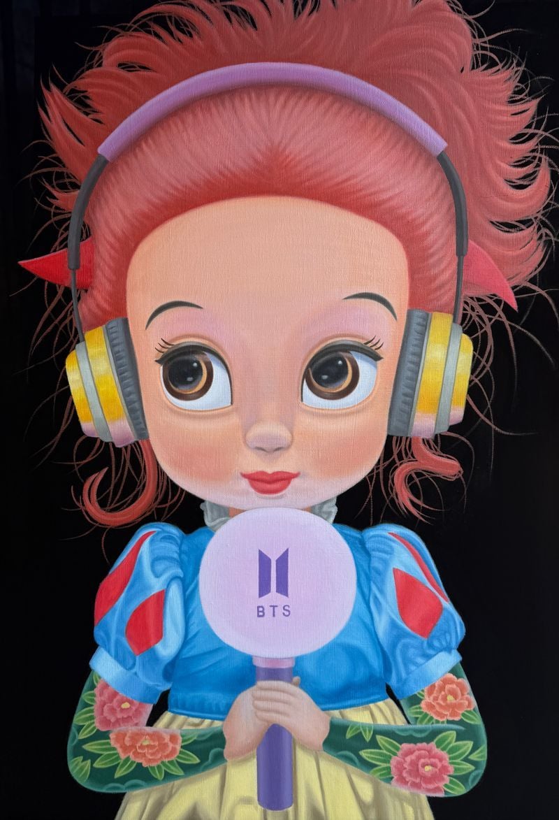 이번 전시가 흥미로운 이유는 신을 향한 질문이 전통 종교의 영역에만 머물지 않는다는 점이다. 작가는 BTS의 응원봉인 ‘아미밤’을 든 백설공주를 통해 오늘날 젊은 세대가 사랑하는 대상을 향해 기꺼이 추종자가 되는 심리를 포착한다. 거대 종교가 삶의 해답을 제시하지 못하는 시대, 아이돌은 누군가에게 안식처이자 삶의 방향을 가리키는 실존적 나침반이 된다. 이희상은 이러한 현상을 비판적으로 재단하기보다, 현대인이 믿음을 형성하는 방식 자체를 예민하게 관찰하며 회화로 치환한다.