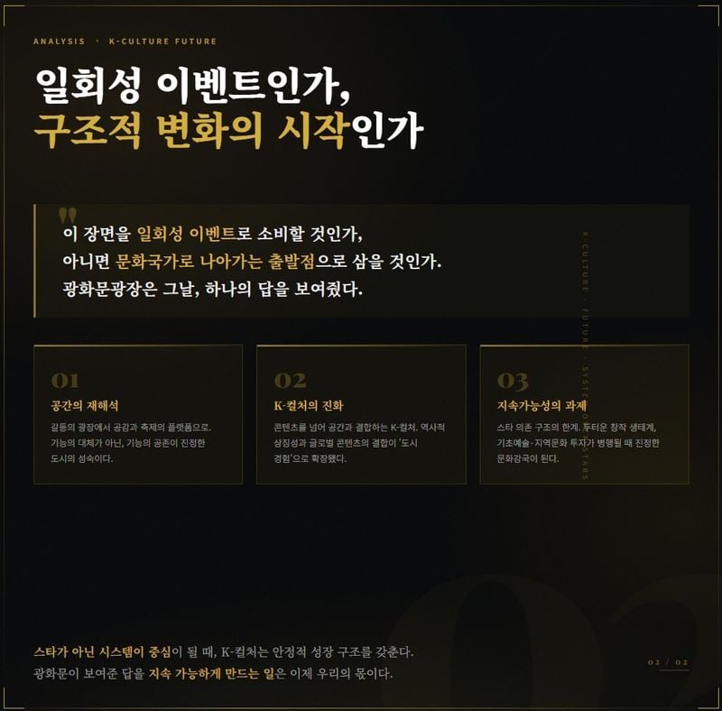 이번 공연이 특히 의미 있는 이유는 K-컬처의 진화 방향을 보여줬기 때문이다. 이제 K-컬처는 콘텐츠 자체를 넘어 공간과 결합하고 있다. 광화문이라는 역사적 상징성과 K-팝이라는 글로벌 콘텐츠가 결합되며, 하나의 ‘도시 경험’으로 확장된 것이다.