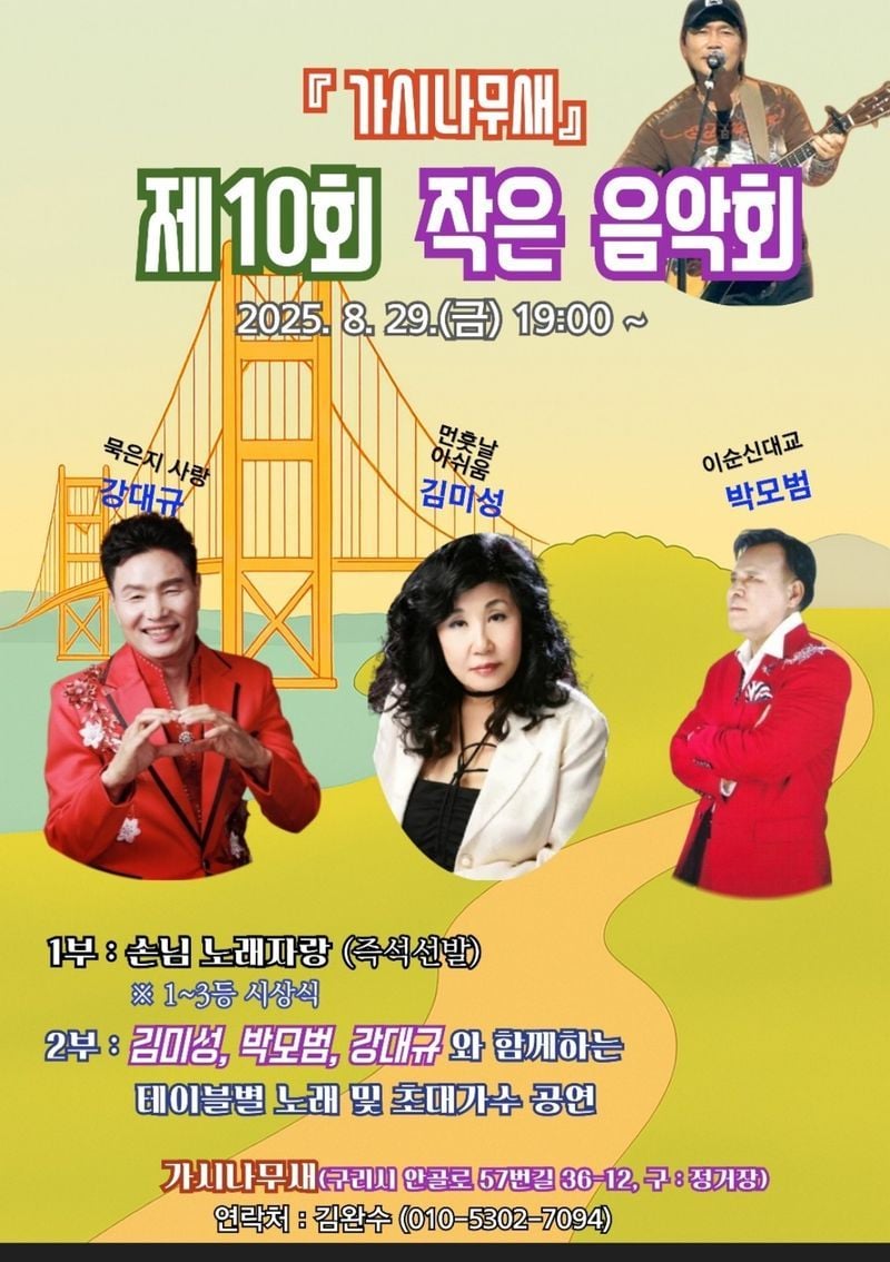 경기도 구리의 ‘가시나무새 7080 라이브 카페’가 원로 (레전드)가수와 신인가수가 함께하는 음악회로 매주마다 열리고 있음에 모든사람들의 시선과 발걸음이 이 작은 음악회를 보기 위하여 줄을서는 훈훈한 광경이 이곳에서 펼쳐진다.
