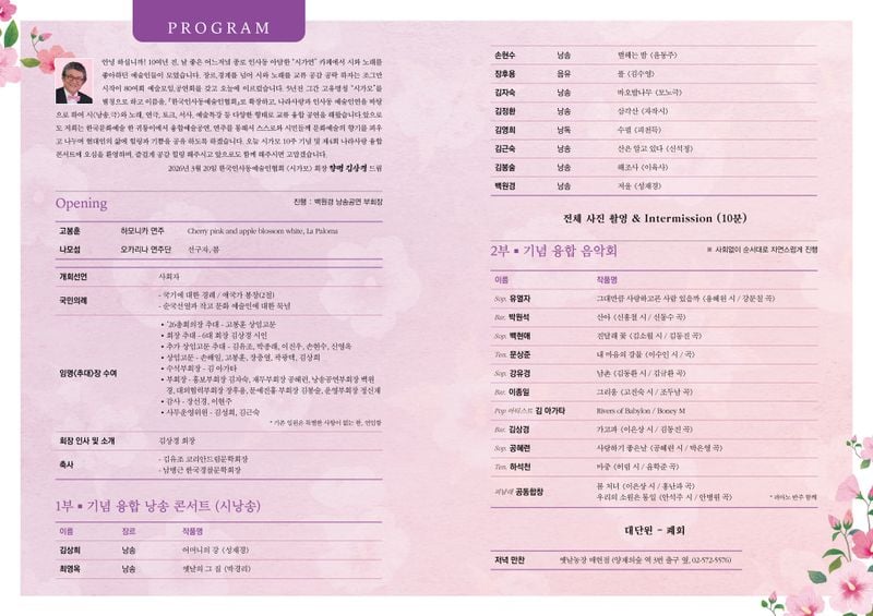 행사는 1부 기념 융합 낭송 콘서트와 2부 기념 융합 음악회로 나눠 진행되며, 백원경 낭송공연 부회장이 사회를 맡아 개회선언을 하고 임원 임명(추대)장 수여 시간과 김상경 회장의 인사, 김유조 코리안드림문학회장과 남병근 한국경찰문학회장의 축사가 있을 예정이다.