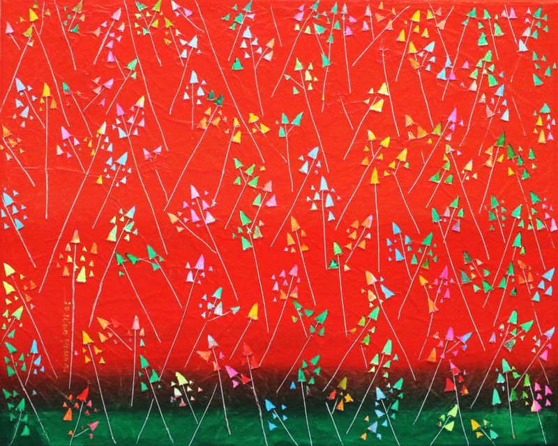 작가는 ‘둥근 하늘’과 ‘네모난 땅’ 사이에 존재하는 사람들을 여러 색상의 ‘세모 기호’로 나타낸다. 붉은색, 초록색, 파랑, 노랑 등 선명한 색채로 채워진 작은 세모들은 개별 존재의 에너지이자, 서로 다른 삶이 모여 하나의 생태계를 이루는 장면이다. 세모 기호들이 빽빽하게 군집하는 화면은 시각적 리듬과 활기를 만들어내며, 그 속에서 관람자는 자신만의 존재성과 정체성을 자연스럽게 대입하게 된다.