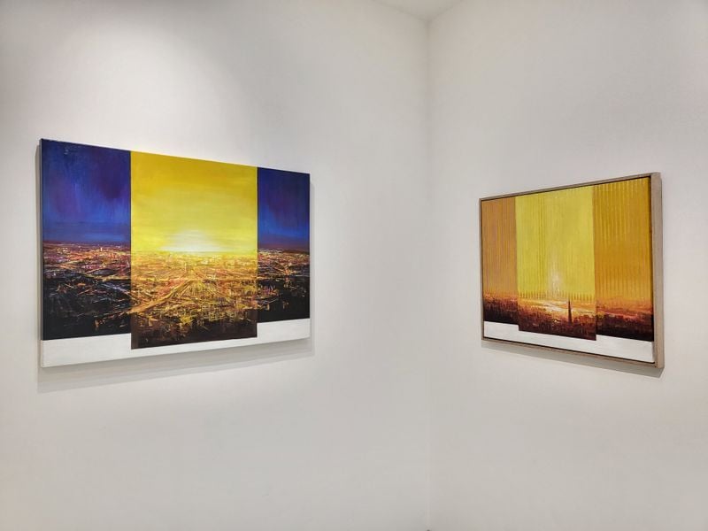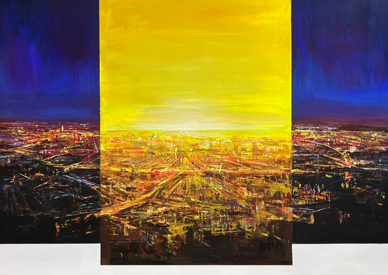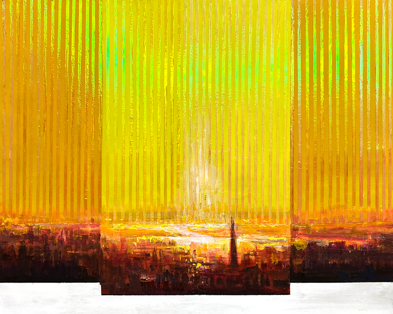 특히 작품들은 중앙에서 빛이 터져 나오듯 확장되는 구조를 통해 시선을 집중시키고, 양쪽으로 펼쳐지는 색면은 공간적 깊이와 시간의 흐름을 동시에 암시한다. 붉은 노을과 황금빛 도시, 혹은 녹색과 황색이 교차하는 자연의 이미지들은 구체적 풍경을 넘어 하나의 감각적 리듬으로 작용하며, 관람자는 그 안에서 자신만의 감정과 기억을 투영하게 된다.