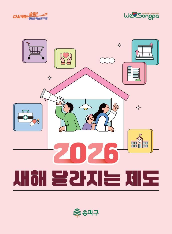 [송파=코리아아트뉴스 이청강 기자] 서울 송파구(구청장 서강석)가 2026년을 맞아 구민 생활과 직결되는 각종 제도를 개선하고, 구민 삶의 질을 높이기 위한 ‘2026년 달라지는 제도’를 26일 발표했다.