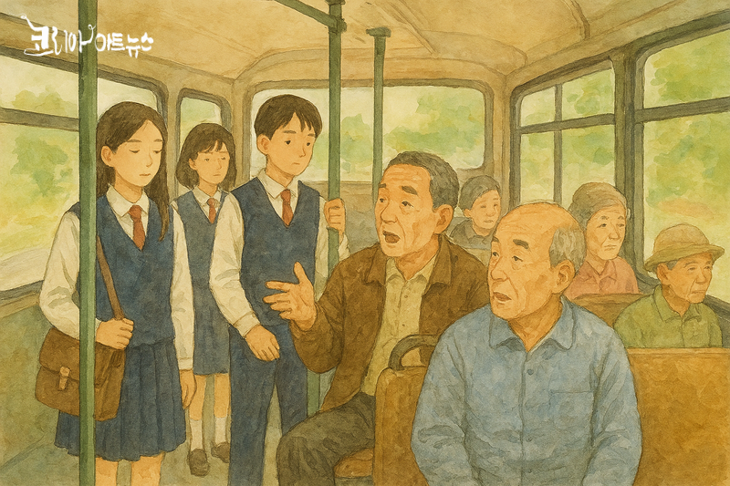 집에 가는 55번 버스를 탄 고등학생 화자는 시화전을 관람한 다른 학교 문예반 남학생들이 탄 버스 안이라 좌불안석이다. 그런데 술에 취한 아버지가 벌소리를 크게 지껄이고 계신다. 부끄러워 미칠 지경이다. 이윽고 내려야 할 곳에 아버지와 함께 내리긴 했는데 집에 같이 가고 싶지도 않을 것이다.