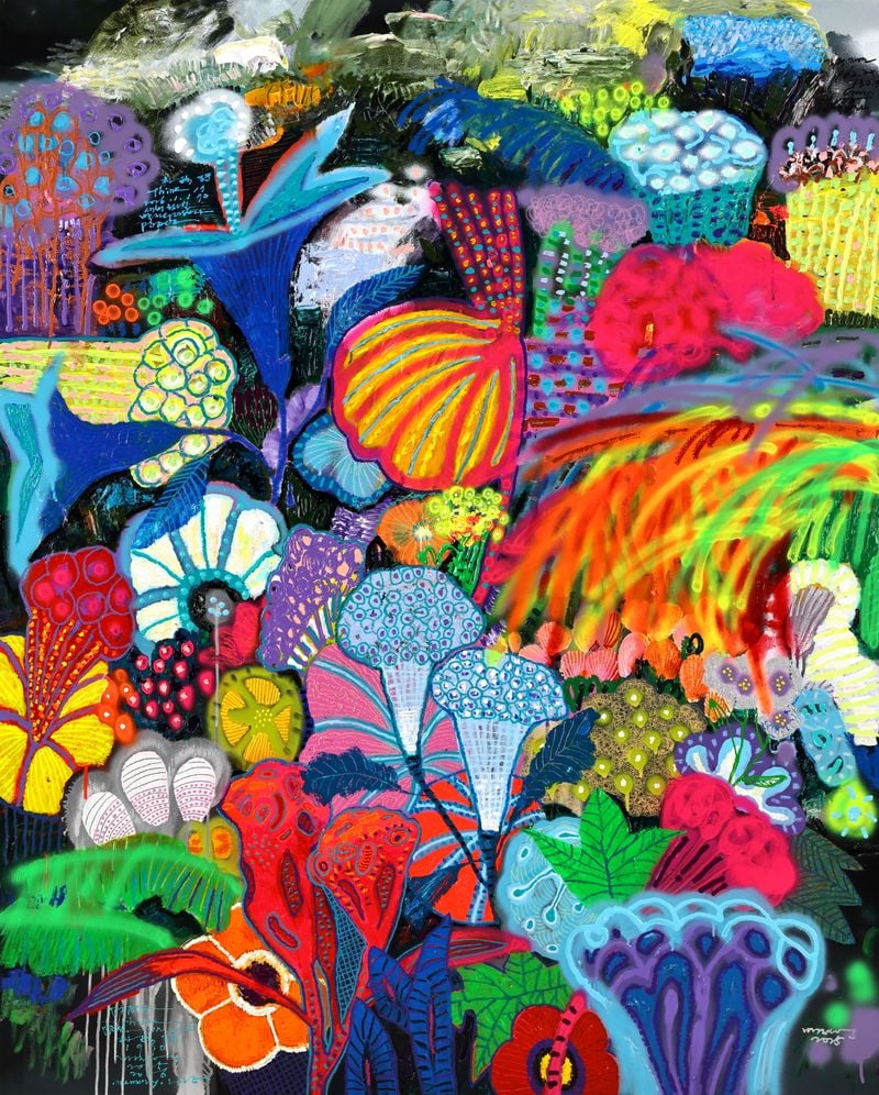 전시 키워드는 ‘기억(thinking memory)’이다. 박진우는 일상의 사물과 감정, 기억의 단편을 화면 위 시각 언어로 번역하며, 단순한 재현을 넘어 무형의 개념을 회화적 상징으로 치환해 관람자의 내면에 잠재된 기억과 감각을 자극한다. 화면에 반복적으로 등장하는 꽃, 기호, 무의식의 드로잉은 ‘기억 조각’이자 ‘감정의 흔적’으로 공존하며, 꿈의 단편들이 겹쳐진 듯한 심리적 풍경(psycho scape)을 구성한다.