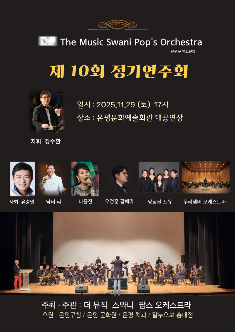 [음악=코리아아트뉴스 이청강 기자] 더뮤직스와니팝스오케스라(회장 이영만)는 "오는 11월 29일 오후 5시, 서울 은평구 소재 은평문화예술회관 대공연장에서 '제10회 정기연주회' 공연을 개최한다." 고 밝혔다.