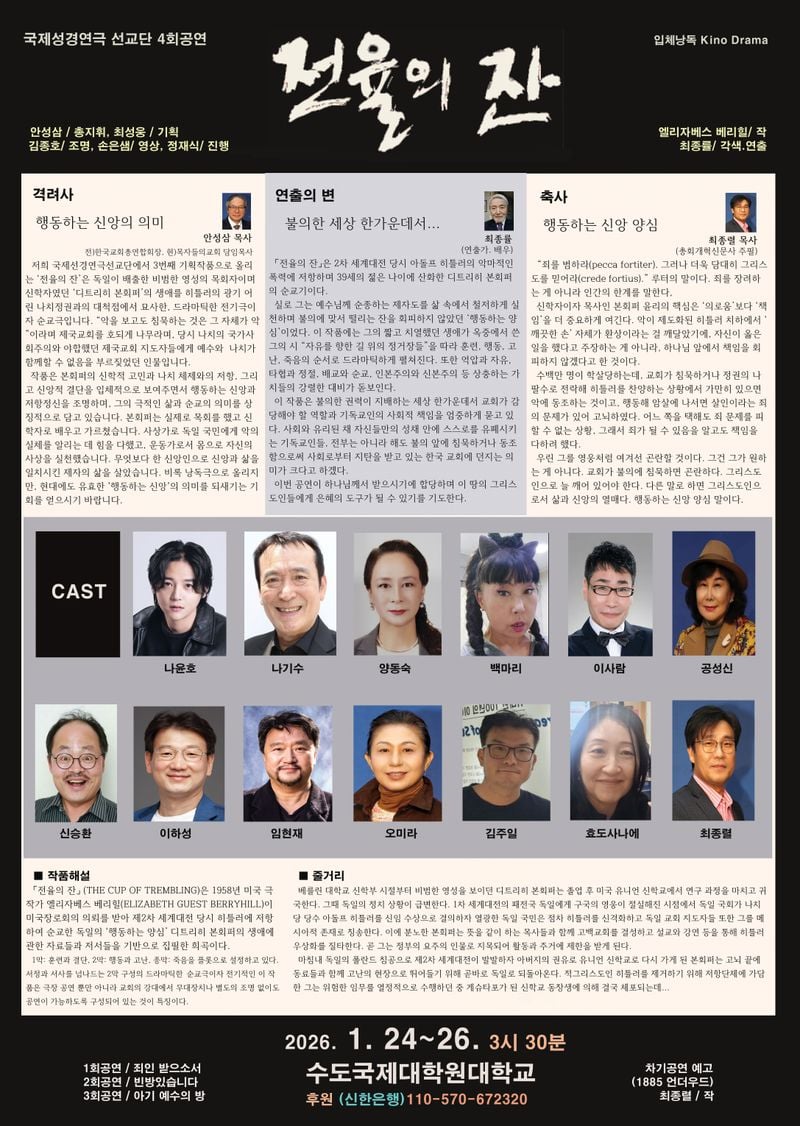 국제성경연극 선교단이 오는 1월 24일부터 26일까지 수도국제대학원대학교에서 제4회 정기공연 「전율의 잔」을 선보인다. 이번 작품은 미국 작가 엘리자베스 베리힐이 1958년에 집필한 희곡으로, 대공황과 전쟁의 상흔이 남아 있던 시대 속에서 복음의 진리를 선포하는 인물들의 이야기를 담고 있다.