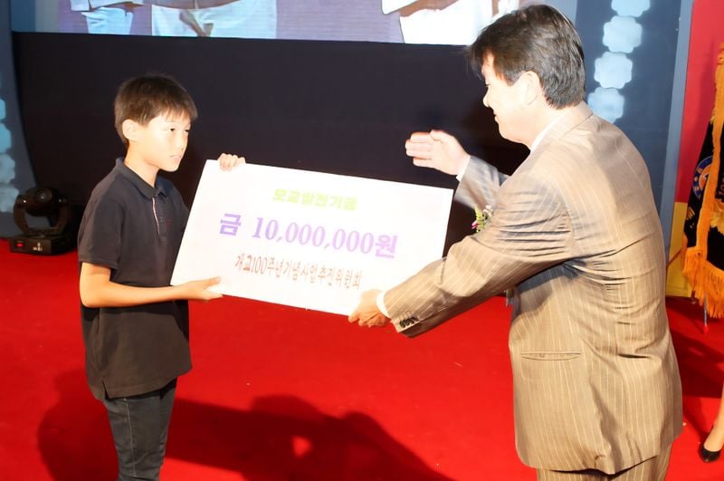 해당 사진 속 최재명은 단정한 머리와 복장으로 무대에 올라, 당당하게 발전기금 증서를 받는 모습이 담겨 있다. 발전기금을 전달한 인사는 당시 100주년기념사업 추진위원장 윤의명 선배로, 세대를 잇는 따뜻한 장면으로 기억되고 있다. 윤 위원장은 장수초등학교의 100년 역사를 기념하며, 동문과 지역 사회가 함께 학교의 미래를 응원하는 뜻을 담아 발전기금을 전달했다.