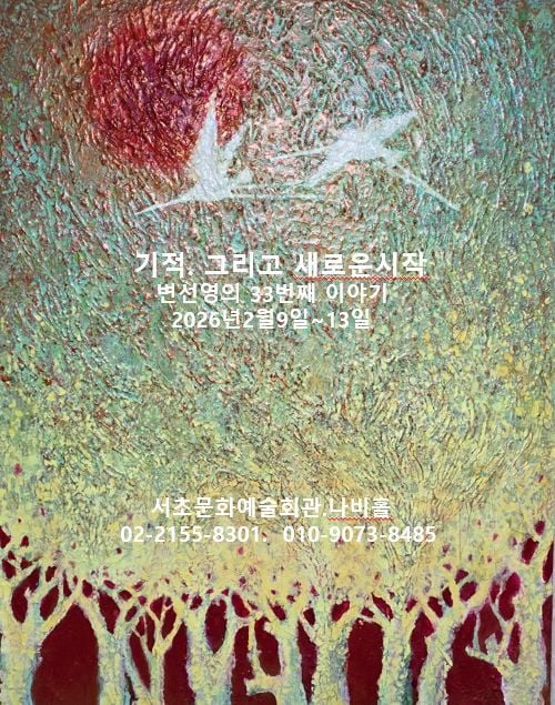 [전시= 코리아아트뉴스 김재옥 기자] 변선영 작가는 서초구청에서 운영하는 서초문화예술회관 나비홀에서 오는 2026년 2월9일부터 13일까지 나비홀갤러리 에서 33번째 개인전을 한다.