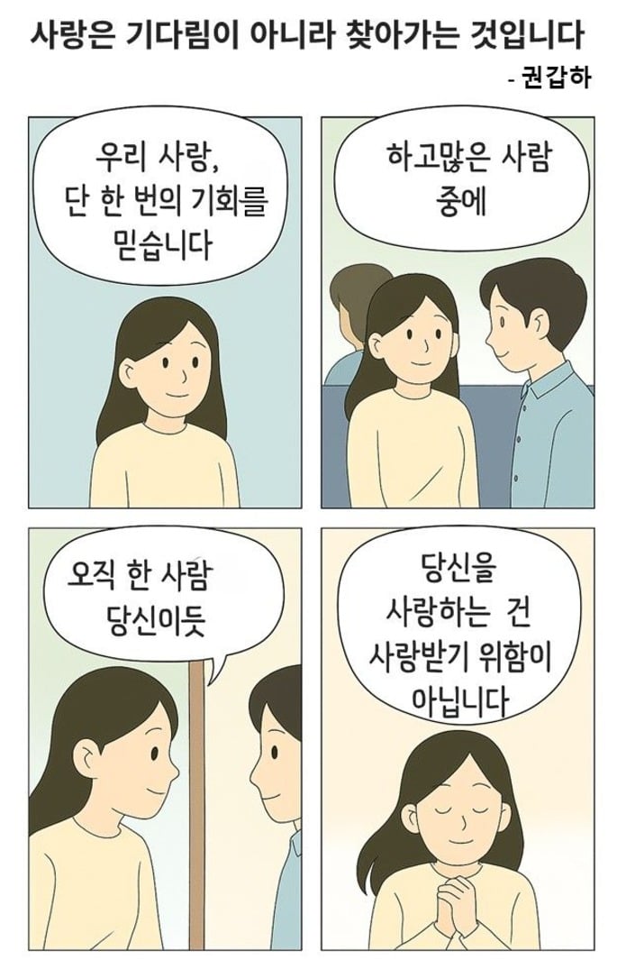 또한 “당신을 사랑하는 건 사랑받기 위함이 아닙니다”라는 대목은 사랑을 거래로 보지 않는 태도를 드러낸다. 사랑은 장부가 아니라 흘러넘치는 마음이라는 것이다. 이쯤 되면 시인은 연애 철학자가 아니라 연애 혁명가에 가깝다.