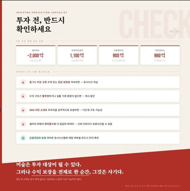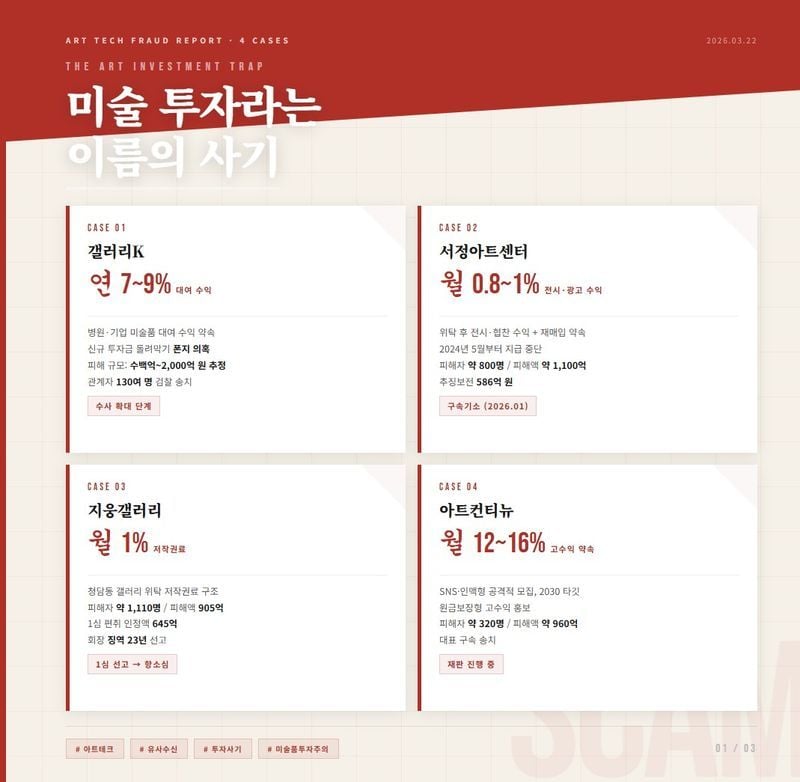 가장 전형적인 “고급 갤러리 외형을 가진 아트테크 사건”으로 평가됩니다. 투자자들에게 작품을 구매해 센터에 맡기면 전시·광고·협찬 수익으로 매달 0.8~1% 수익금을 지급하고, 만기에는 재매입으로 원금 보장까지 약속한 것으로 조사됐습니다. 그러나 2024년 5월 무렵부터 지급이 중단됐고, 2026년 1월 기준 대표는 사기·유사수신 혐의로 구속기소, 피해자는 약 800명, 피해액은 약 1,100억 원, 검찰은 586억 원 추징보전 조치를 했습니다.
