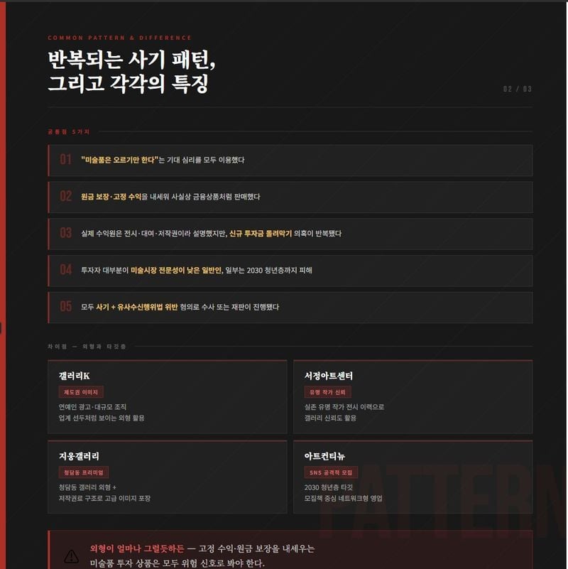 | 특징 | 업계 선두 이미지·연예인 광고·대규모 조직성 | 실존 유명 작가 전시 이력으로 신뢰 확보 | 청담동 갤러리 외형과 저작권료 구조 | 청년층 대상 SNS 영업·모집책 다수 |