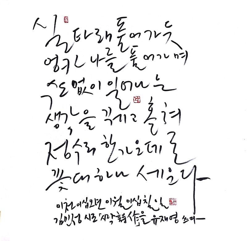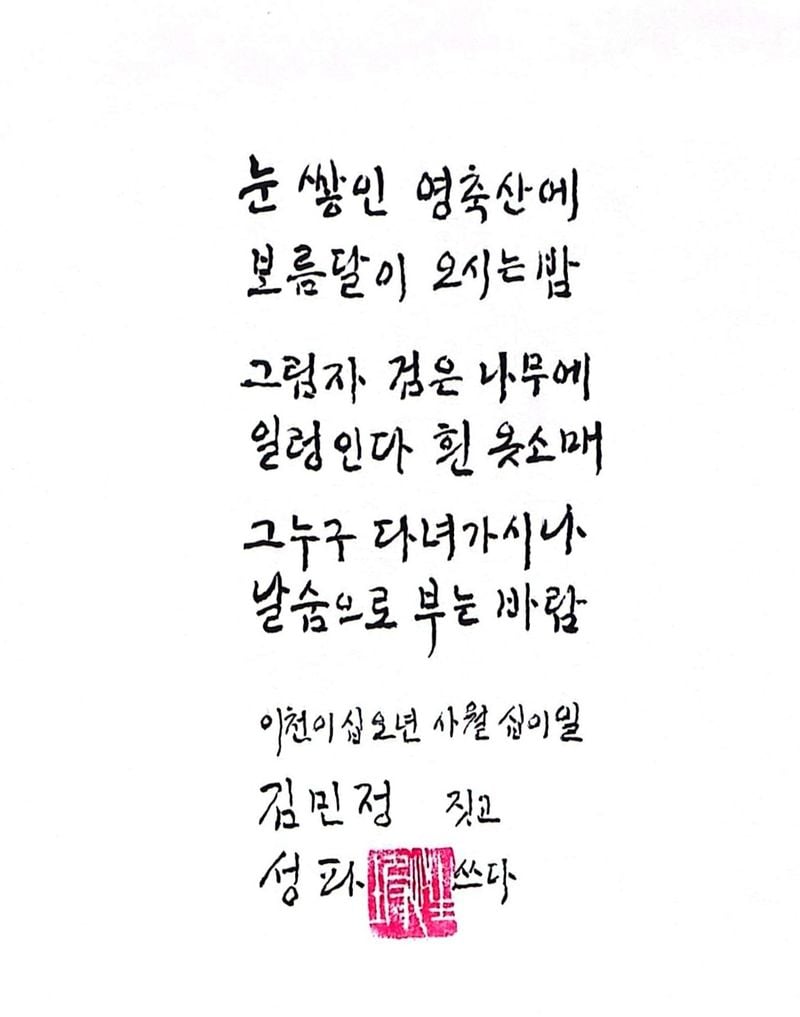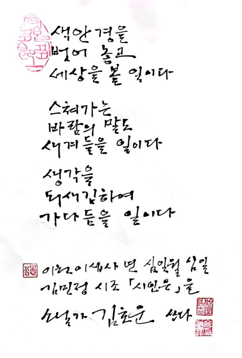 김민정 시인은 지난 1년에 걸쳐 본인 자작詩 작품을 가까운 문인들에게 육필로 써 주기를 부탁했다. 고진감래(苦盡甘來) 끝에 받은 150여 점을 김민정 시인은 서울 인사동 한국미술관 3층에 전시하는 기쁨을 누렸다.